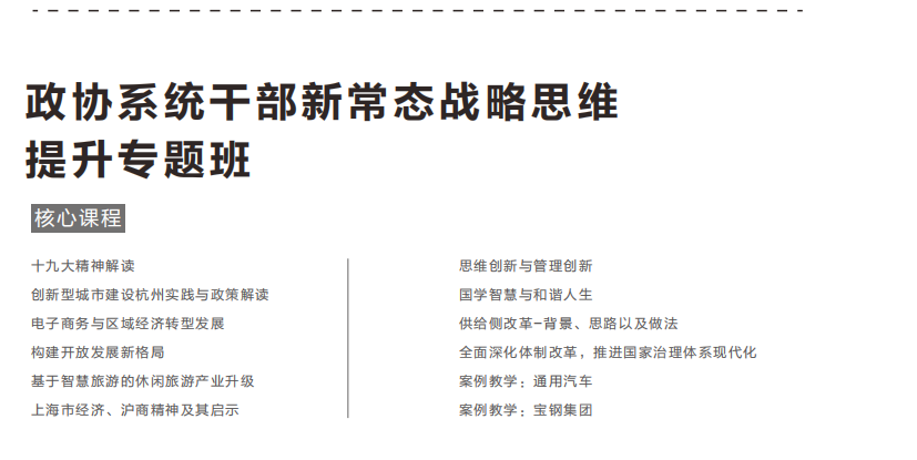 【培训师资】 上海交通大学教授,市政府和地方政府专家等。 【培训方法】 课堂讲授、现场体验与学习参观、交流互动、专家点评相结合。 【培训费用】 根据委托培训单位参训人员数和具体培训方案而定。