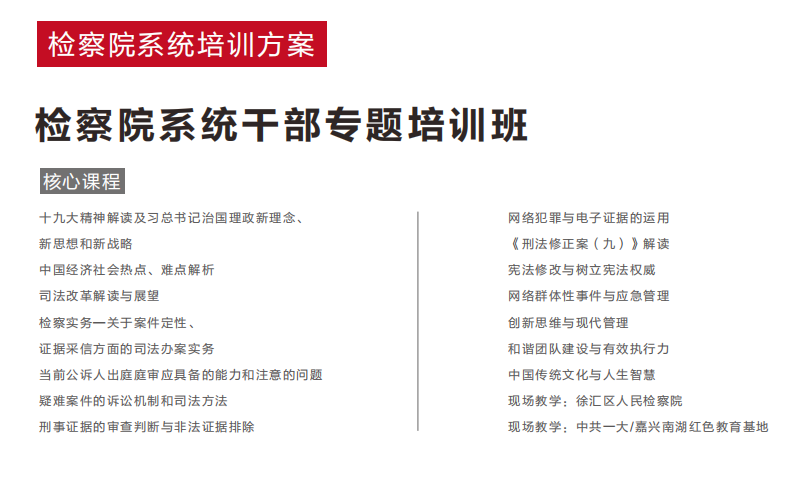 法院干部综合能力提升【培训目的】 十九大强调,党的领导是全面推进依法治国、加快建设社会主义法治国家最根本的保证。我们党是一个有着8600多万党员的大党,肩负着带领13亿人民 走中国特色社会主义道路的艰巨任务。新形势下党面临“四大考验”、“四种危险”,面对着各种挑战和风险,管党治党任务极其繁重。习近平总书记要求,全党同 志要深刻认识反腐败斗争的长期性、复杂性、艰巨性,以猛药去疴、重典治乱的决心,以刮骨疗毒、壮士断腕的勇气,坚决把党风廉政建设和反腐败斗争进行到底。 【培训对象】 各省、市、自治区、直辖市等各级检察院系统干部培训。 【核心课程】 课程仅供参考,或根据单位量身定制培训课程方案。