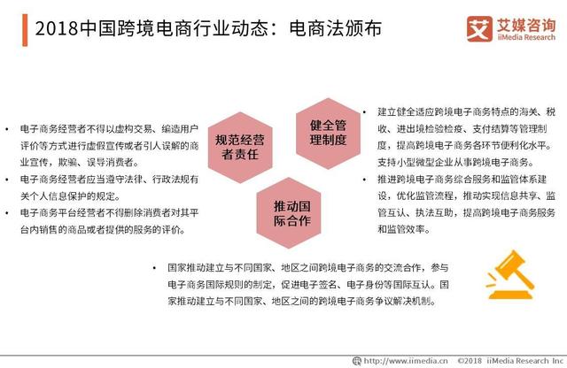 2018年8月31日,第十三届全国人大常委会第五次会议通过了《电子商务法》,于2019年1月1日正式实施,这是我国电商领域首部综合性法律。艾媒咨询分析师认为,电商法约束和规范了电子商务市场,提升市场整体品质,保障消费者合法权益的同时也鼓励并支持跨境电商行业的发展,推动整个电商行业积极发展。